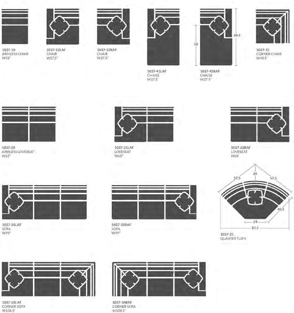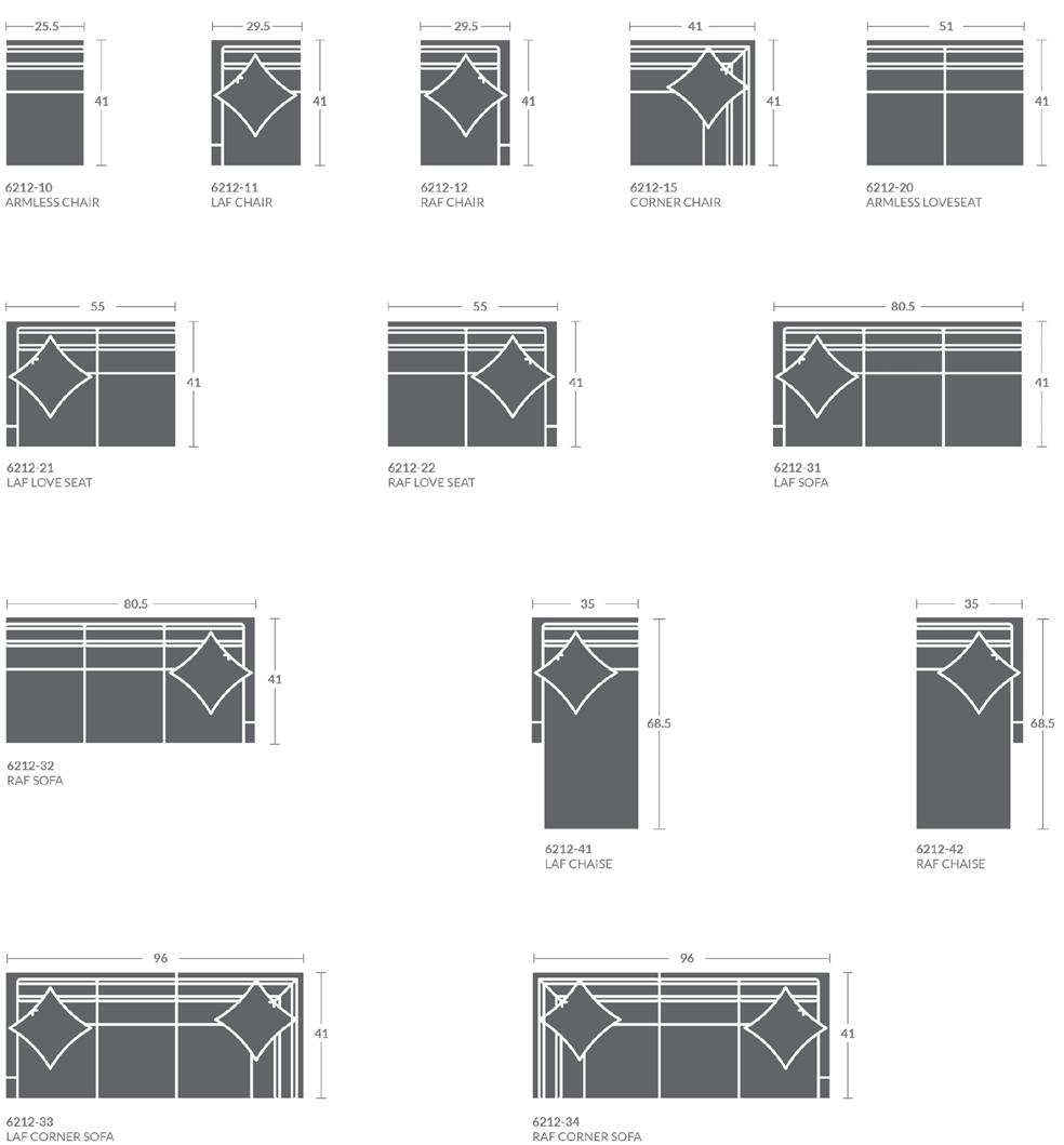 *DIAGRAMS NOT TO SCALE. PLEASE SEE WEBSITE FOR QUARTER INCH SCALE. SOFAS, LOVESEATS, CHAIRS AND OTTOMANS NOTE: BOX BORDER SEMI-ATTACHED BACK/19” Throw pillows