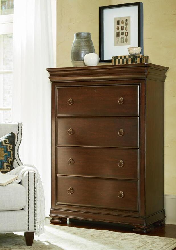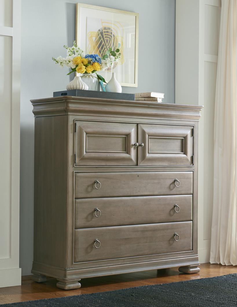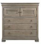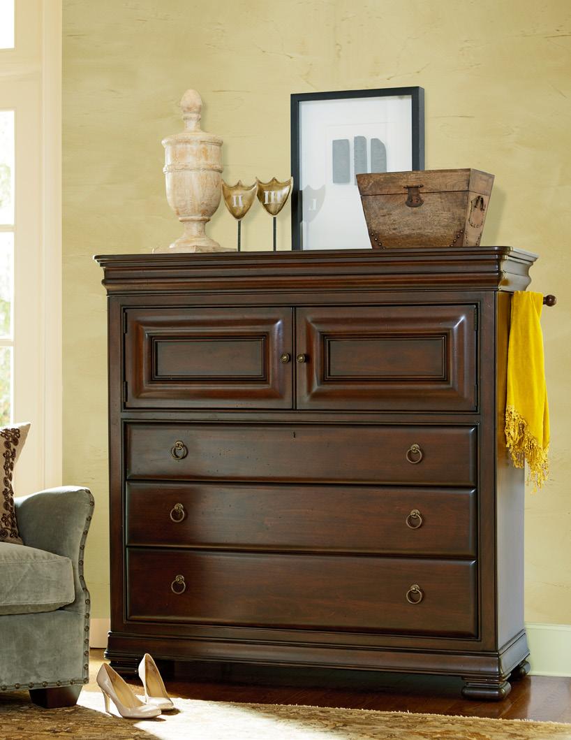 Three large drawers. Two doors with adjustable shelf. Two tray drawers. Pull out clothing rod. Jewelry tray. Cedar bottom in bottom drawer. Hidden side drawers.