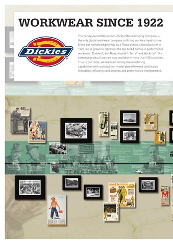 Workwear since 1922 The family-owned Williamson-Dickie Manufacturing Company is the only global workwear company outfitting workers head-to-toe. Since our humble beginnings as a Texas overalls manufacturer in 1922, we’ve grown to represent the top brand names in performance workwear: Dickies®, Van Moer, Kodiak®, Terra® and Workrite®. Our extensive product lines are now available in more than 100 countries. True to our roots, we maintain strong manufacturing capabilities with a production model geared toward continuous innovation, efficiency and process and performance improvement.