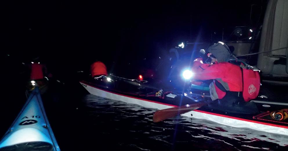 auton valojen palaessa ja poutasäässä, vaikka ennusteiden perusteella odotimme märempää. Kajakkivalojen tuikkiessa lähdimme ennen iltayhdeksää navigoimaan kohti Isoa Lammassaarta neljän kilometrin päässä.