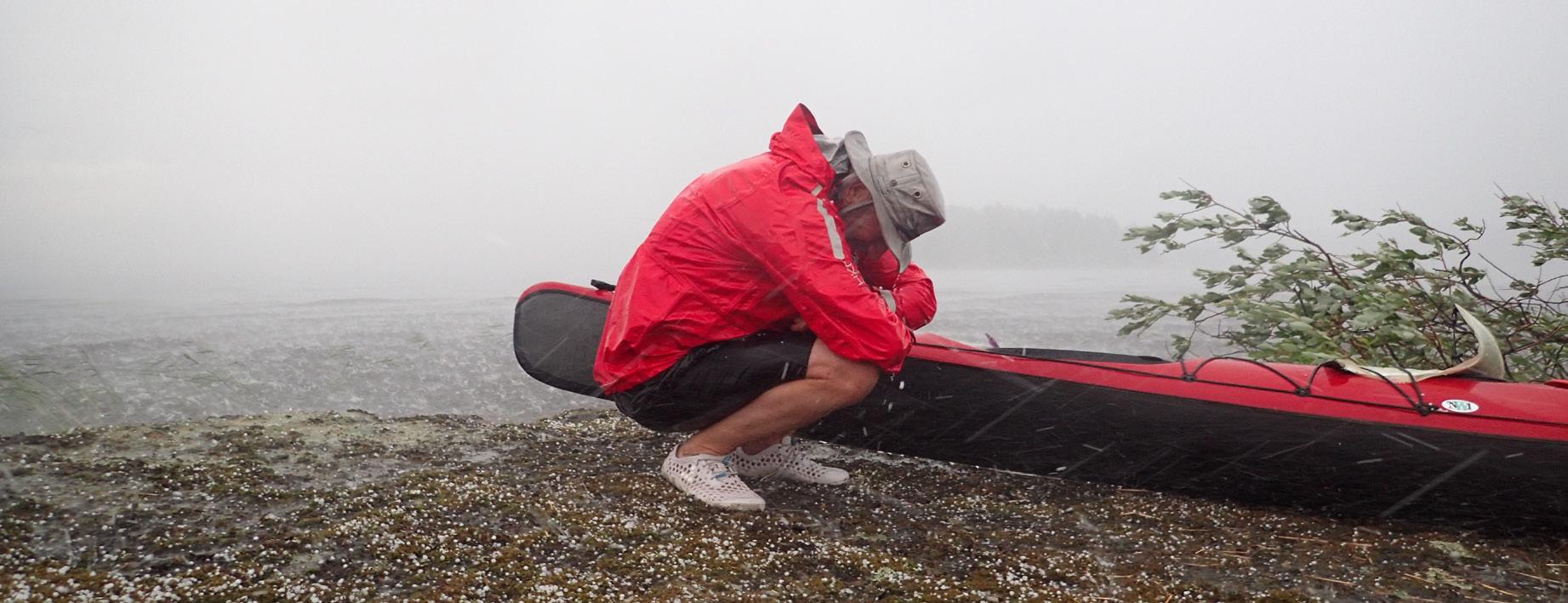 Halmesaaren kärjessä nousimme kallioluodolle pukemaan anorakkeja. Pisarat jo tippuivat, kun Laura vielä askarteli puseronsa kanssa. Sade yltyi ja tuuli voimistui niin, ettei ollut puhettakaan vesille paluusta. Aallot kuohasivat luodon päälle, ja vedimme kajakit ylemmäksi. Kovan tuulen mukana alkoi tulla rakeita, jotka kimposivat kajakeista ja kalliosta. Kyykimme tuulta vasten, mutta rakeet piiskasivat kipeästi paljaita sääriä. Onneksi lierihattu suojasi päätä.