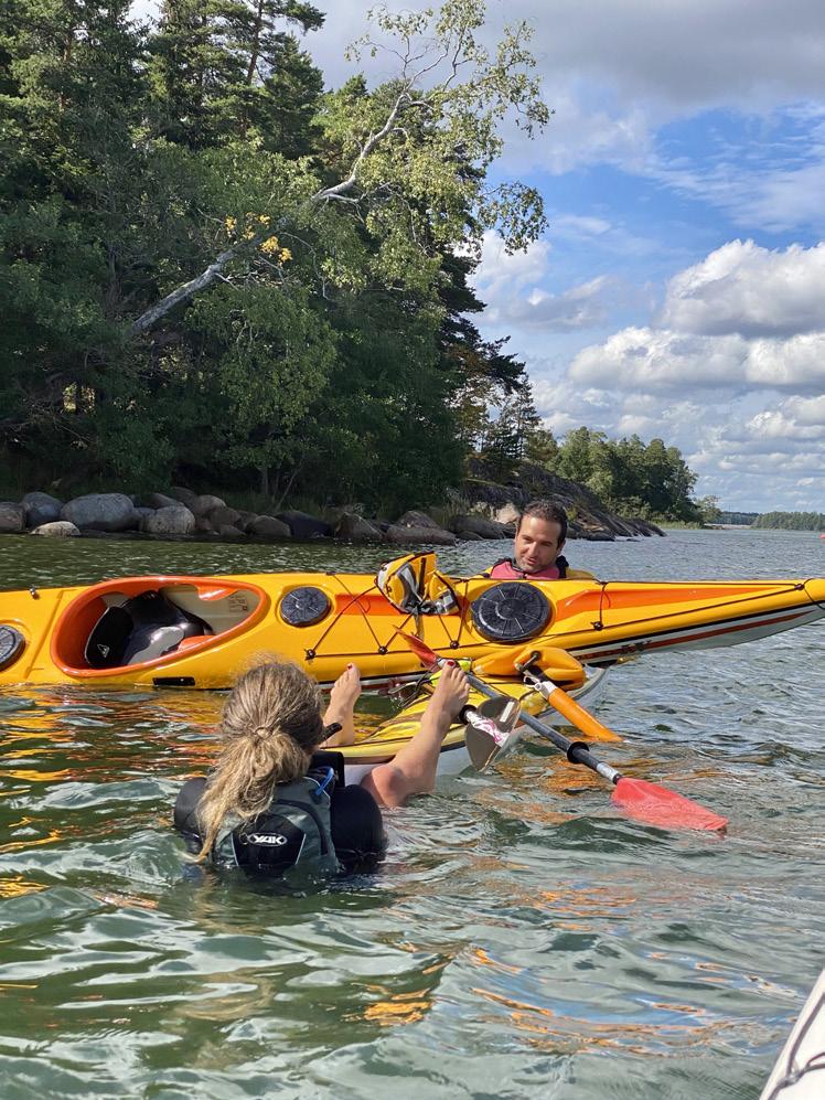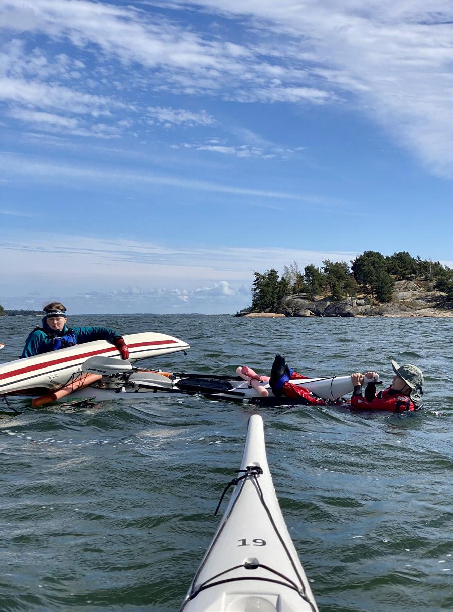 Esittelykierroksen jälkeen jakauduimme melontakokemuksen mukaisiin ryhmiin ja lähdimme pienissä porukoissa ohjaajien johdolla lähivesille. Aamupäivän teemana oli varmuuden saaminen paripelastautumiseen kaikissa rooleissa, minkä jälkeen siirryttiin treenaamaan kajakkiin kapuamista yksin. Apuna käytettiin melakelluketta ja eri tekniikoita.