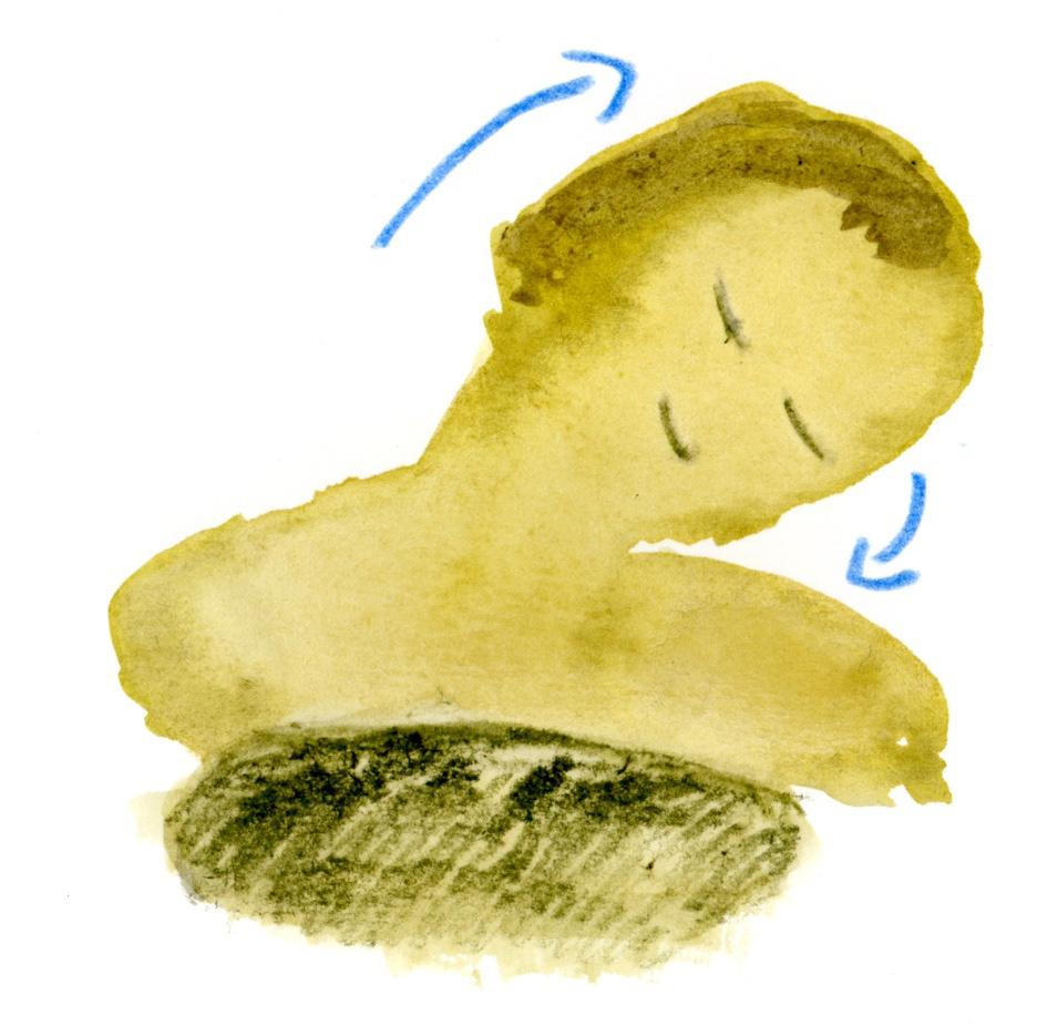 Tunne pitkä selkä ja niska ja hyvä ryhti niin, että nikamien välissä on tilaa. Uloshengityksellä tuo vasenta korvaa kohti vasenta olkapäätä ja lempeästi ja tietoisesti keinuta päätä hieman alaviistoon ja taas korvaa kohti olkapäätä. Jatka muutaman hengityskierroksen ajan ja tee toisella puolella. Voit lopuksi vielä tehdä selkärangan rullailua uloshengityksellä tullen eteentaivutukseen ja sisäänhengityksellä nousten ja kurotellen käsiä kohti taivasta.