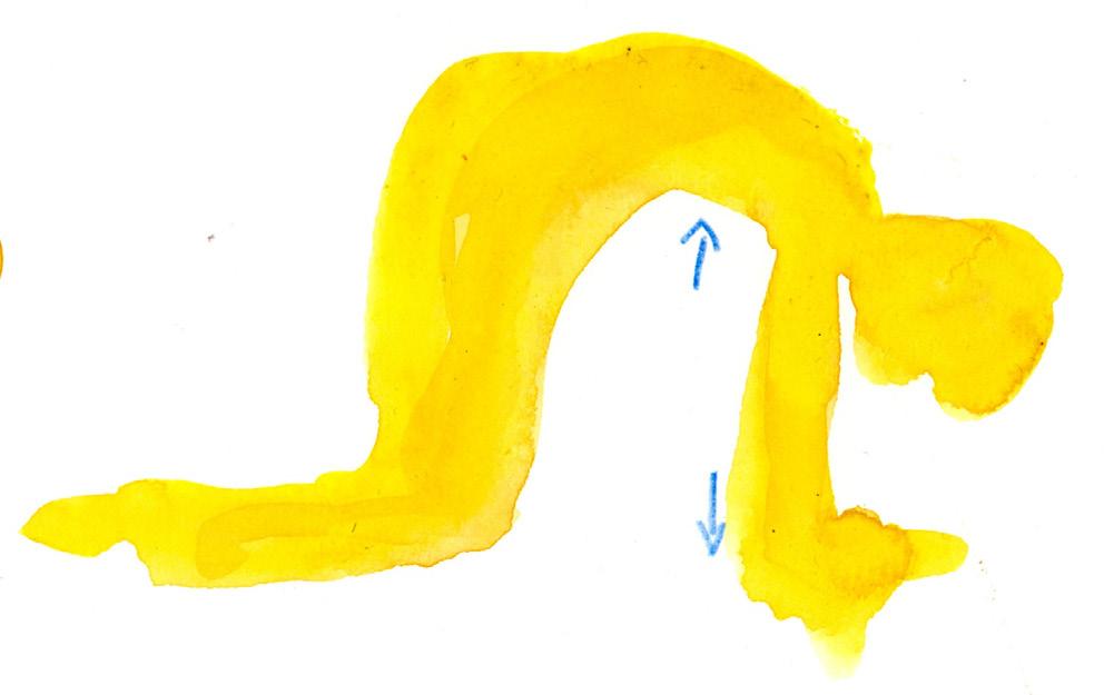 Uloshengityksellä pyöristä selkää työntäen käsiä kohti maata ja lapoja kohti kattoa. Sisäänhengityksellä ojenna ja notkista lempeästi selkää niin, että rintakehä avautuu ja vatsan alueelle tulee tilaa. Pidä huoli ettet nosta leukaa liian ylös ja tilttaa niskaa. Työskentely tapahtuu lanne- ja rintarangan alueella.