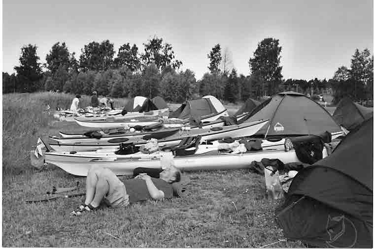Me muut meloimme suoraan leiripaikkaan, seurakunnan leirikeskukseen. Krista ohjasi erinomaisen venyttelyn. Pojat ja paikalliset kirkonmiehet (?) nauttivat kertalämmitteisen saunan hyvistä löylyistä. Melojattarille kiukaasta riitti vaimeita pihauksia. Leirissä oli jo pimeää, kun kauppamiehet tulivat perille. He saivat päivän