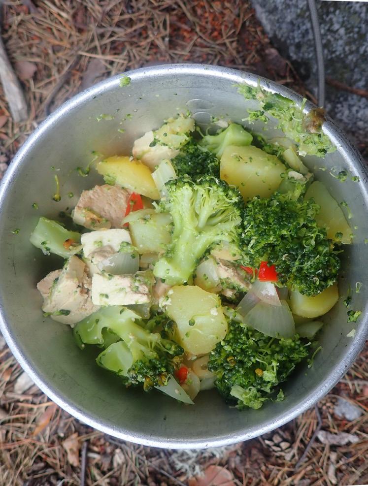 1. Keitetään pilkotut potut ja parsakaali al denteksi— tietenkin merivedessä, että saadaan makua.