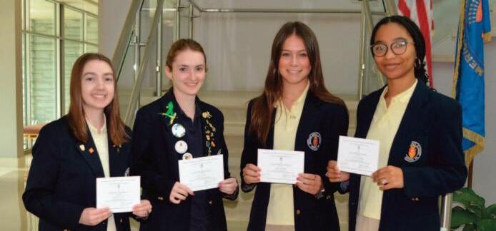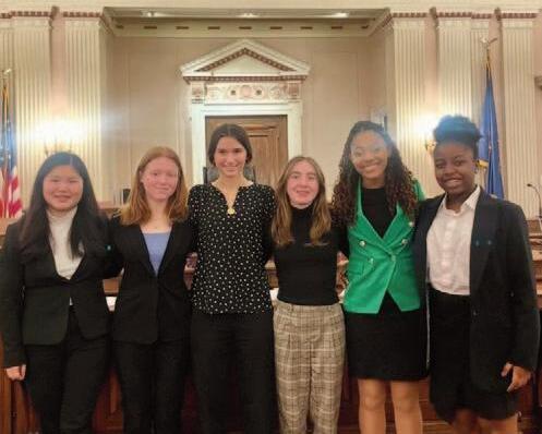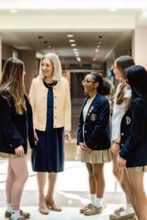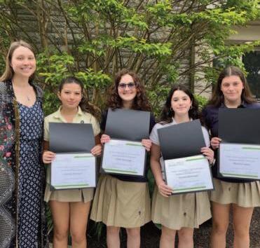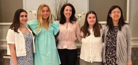 Madelyn O’Neill ’26, Stacey Reese ’26, Hazel Boczkowski ’27 and Maya Hogan ’26 with Head of School Marianne Grace, P’04