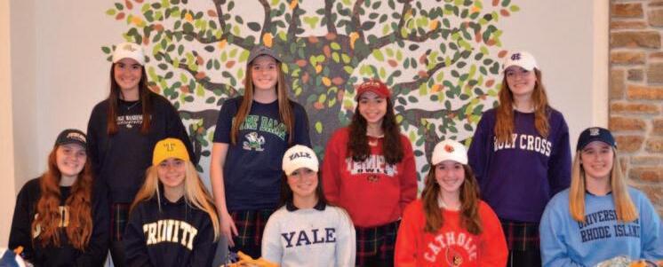 [back row] Emily Kallmeyer, George Washington University, Rowing; Elle Kilgannon, University of Notre Dame, Rowing; Sofia Henningsen, Temple University, Rowing; Dillan Grimes, College of the Holy Cross, Rowing; Sofia Fisher, Sacred Heart University, Rowing [front row] Molly Mishinkash, Juniata College, Volleyball; Ella Cait Lisowski, Trinity College, Field Hockey; Grace O’Connor, Yale University, Rowing; Molly Romano, Catholic University of America, Field Hockey; Keira Vaughan, University of Rhode Island, Rowing