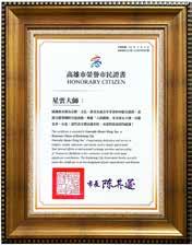 創會會長星雲大師 榮獲「高雄市榮譽市民證書」