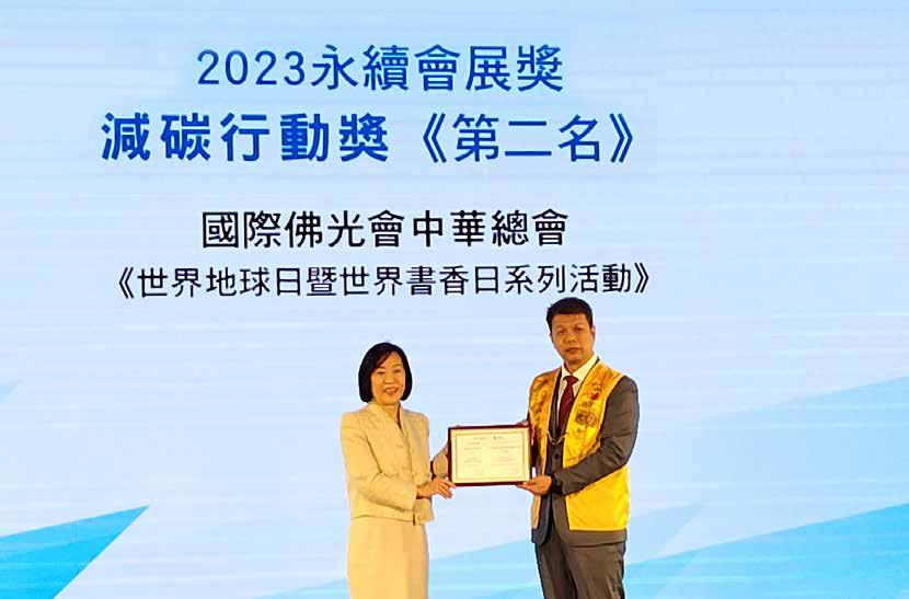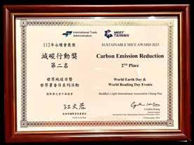 On December 19, 2023, the International Trade Administration, Ministry of Economic Affairs hosted the Sustainable MICE, Taking Strides Towards Net Zero Sharing Event and the Sustainable MICE Awards Ceremony. At the World Earth Day and Book Fair, BLIA Chunghua planted 1,000 trees to take a concrete step towards reforestation, and provided vegetarian meals without the use of disposable utensils. It achieved a reduction of carbon emissions by 282.18 metric tons, earning it second place in the Carbon Reduction Action Awards category of the Sustainable MICE Awards. Pure Green Foundation CEO and World Headquarters Lay Dharma Lecturer Anderson Tai received the award on behalf of BLIA Chunghua.