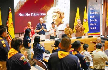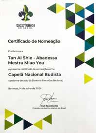 於開幕儀式前,為佛教舉辦一場授證儀式,由聯盟主席 Ivan Alves do Nascimento、第二副主席Carmen Barreira和童軍行政委員會主 任Daniela De Oliveira Rodrigues Gomes共同授予南美洲總住持妙 佑法師「巴西國家童軍團佛教導師」證書,期許未來能為全國 10 萬童軍提供淨化人心的佛教常識和教義。妙佑法師感謝巴西國家 童軍給予機會為巴西童軍服務,並表示創會會長星雲大師積極推 動童軍活動,於全球 14 個國家成立 75 個佛光童軍團,由於童軍與 佛教有很多相同理念,期許在巴西共同創造人間真、善、美。