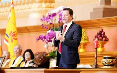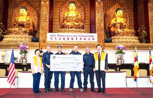 On June 17, 2025, the New Zealand Police hosted its first Inspector Promotion Ceremony using Buddhist ceremonial procedures at Fo Guang Shan North Island. At the ceremony, BLIA North Island Director Anson Lin was promoted from Senior Sergeant to Inspector. Ven. Man Hsin led attendees in a recital of the Heart Sutra, put on Lin’s threestar shoulder marks with his wife, and gifted Founding President Venerable Master Hsing Yun’s “Auspicious Blessings” calligraphy to Lin. Lin’s superiors from New Zealand Police gifted Lin a pounamu, a stone that symbolized strength and courage in Maori culture. More than 150 people, including police officers, community members, and community leaders, were present at the ceremony. Ven. Man Hsin encouraged Lin to continue illuminating society with compassion and wisdom; Lin reaffirmed his commitment to helping the community and serving its members. Inspector Honan praised Lin for his professionalism and excellence, and expressed confidence in Lin to serve even more people in his new role.
