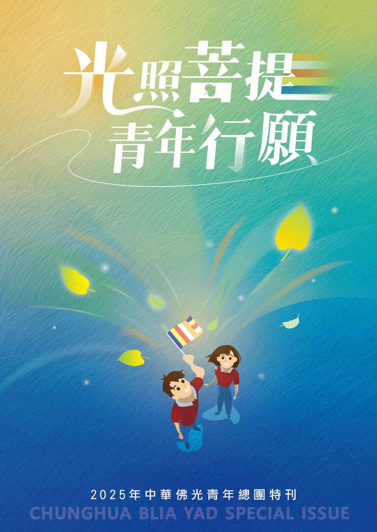「佛教靠我,捨我其誰」,這是星雲大 師給青年的勉勵與期許,也是一份時代賦 予青年的責任與使命。佛光青年無論參與 活動、投入義工、學習佛法、推動文化, 人間佛教都因青年而更新,因青年而有力 量。在全球化快速變動的今日,佛光青年 的心願、行動與承擔,正如同佛教五色旗 一般,象徵著慈悲、智慧、平等、清淨與 希望。