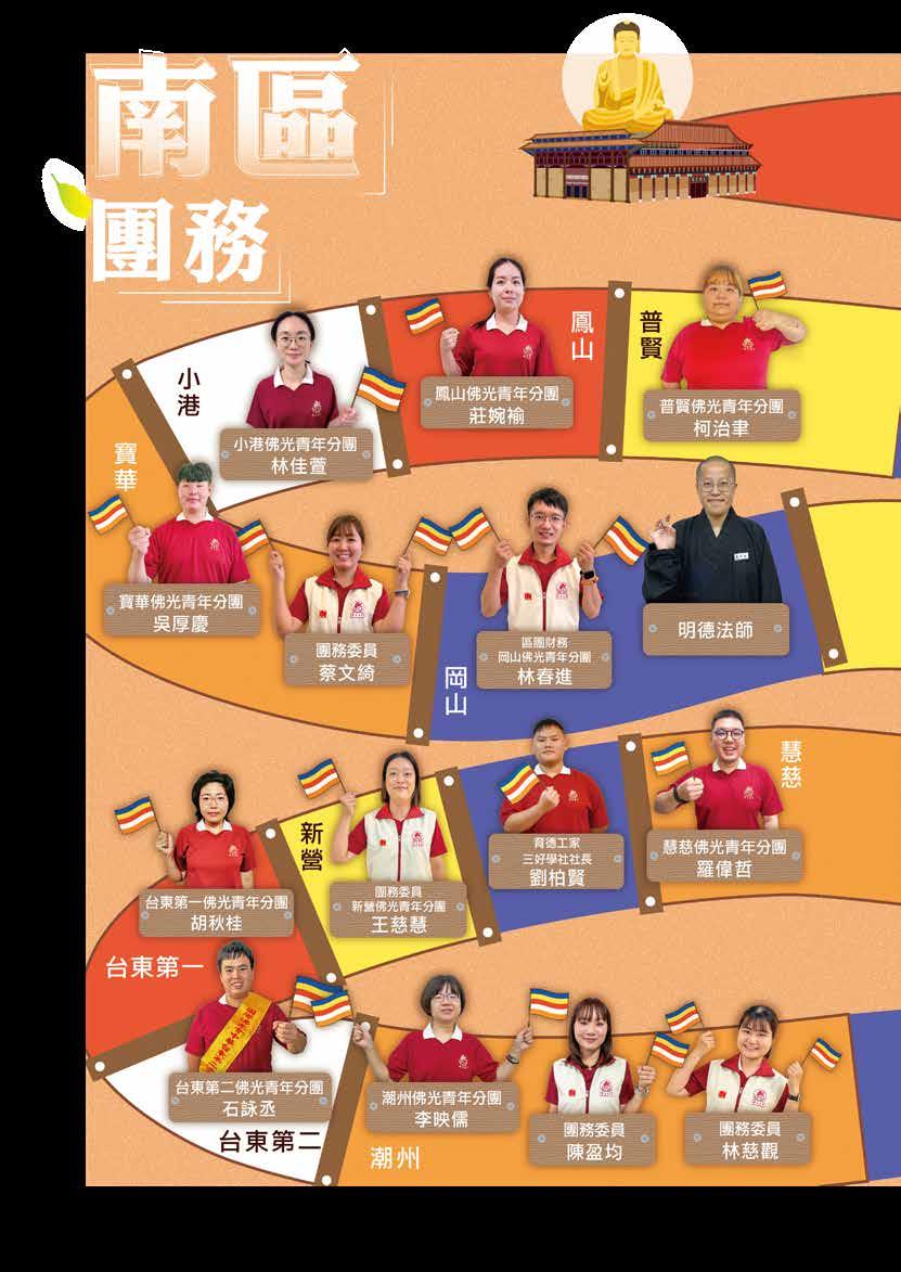 隨後慧傳法師主持交接儀式,見證本次 大會總召南馬區團務長楊育鈮帶領各組組 長,交接給中華總團南區團務長王郁婷、 叢林學院女眾學部組長知竺法師等同時宣 布2026年佛光青年30周年,佛光山見。