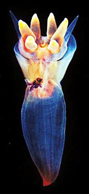 內臟團大量累積從食物 鏈獲得的類胡蘿蔔素, 尤其是在性成熟時期, 會呈現顯目的橘紅色, 這讓裸海蝶宛如吞下一 口火球,在漆黑的海底 分外顯眼招搖。