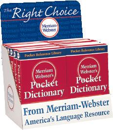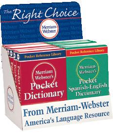 25 DISPLAYS 12-Copy Pocket Dictionary Counter Display (Flexi Paperbacks) 539-1 7 3/8"w x 8 3/4"h x 4 1/4"d 12 copies of Merriam-Webster’s Pocket Dictionary 12-Copy Pocket Dictionary and Thesaurus Counter Display (Flexi Paperbacks) 540-7 7 3/8"w x 8 3/4"h x 4 1/4"d 6 copies of Merriam-Webster’s Pocket Dictionary • 6 copies of Merriam-Webster’s Pocket Thesaurus 12-Copy Pocket Dictionary & Spanish-English Dictionary Counter Display (Flexi Paperbacks) 541-4 7 3/8"w x 8 3/4"h x 4 1/4"d 6 copies of Merriam-Webster’s Pocket Dictionary • 6 copies of Merriam-Webster’s Pocket Spanish-English Dictionary 12-Copy Medical Dictionary Counter Display (Mass-Market Paperbacks) 884-2 9 1/4"w x 11 1/2"h x 9 3/8"d 12 copies of Merriam-Webster’s Medical Dictionary 24-Copy Dictionary and Thesaurus Floor Display (Mass-Market Paperbacks) 895-8 15 1/4"w x 58"h x 14 1/2"d 24 copies of Merriam-Webster’s Dictionary and Thesaurus 38-Copy Dictionary and Thesaurus Mixed Floor Display (Mass-Market Paperbacks) 899-6 14 1/2"w x 47"h x 17"d 28 copies of The Merriam-Webster Dictionary • 10 copies of The Merriam-Webster Thesaurus 12-Copy Dictionary Counter Display (Mass-Market Paperbacks) 936-8 9 1/4"w x 11 1/2"h x 9 3/8"d 12 copies of The Merriam-Webster Dictionary 36-Copy Dictionary Floor Display (Mass-Market Paperbacks) 937-5 14 1/2"w x 47"h x 17"d 36 copies of The Merriam-Webster Dictionary 24-Copy Dictionary Floor Display (Mass-Market Paperbacks) 940-5 9"w x 62"h x 13"d 24 copies of The Merriam-Webster Dictionary 24-Copy Spanish-English Dictionary Floor Display (Mass-Market Paperbacks) 948-1 9"w x 62"h x 13"d 24 copies of Merriam-Webster’s Spanish-English Dictionary 12-Copy Spanish-English Dictionary Counter Display (Mass-Market Paperbacks) 988-7 9 1/4"w x 11 1/2"h x 9 3/8"d 12 copies of Merriam-Webster’s Spanish-English Dictionary ISBN 978-0-87779- DISPLAY TITLE SIZE DIMENSIONS LIST PRICE $71.40 $71.40 $71.40 $102.00 $215.76 $331.62 $107.88 $323.64 $215.76 $204.00 $102.00 884-2 539-1 540-7 541-4