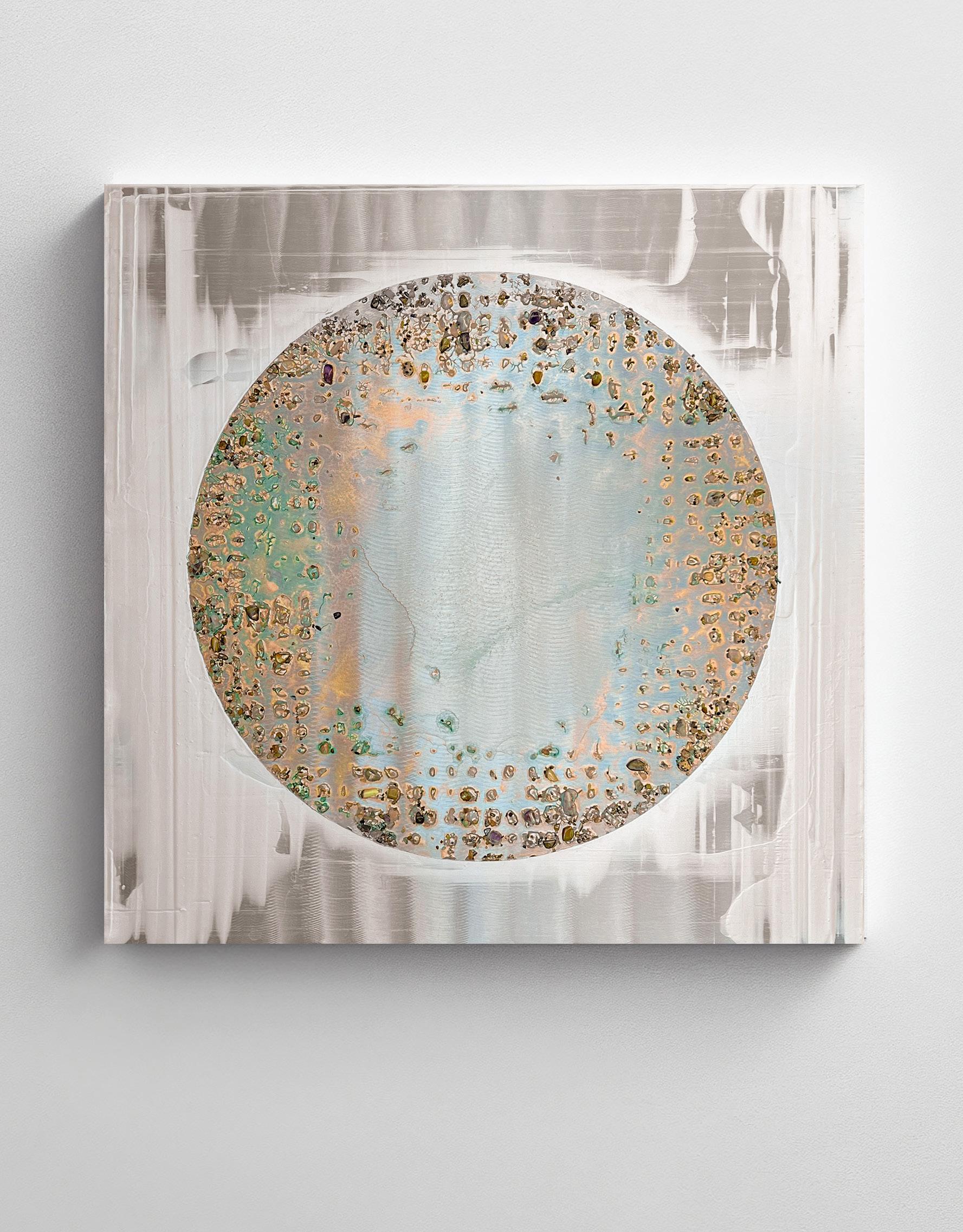 Mixed media on metal · 30 × 30 × 2.5 in.