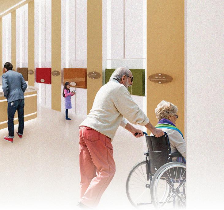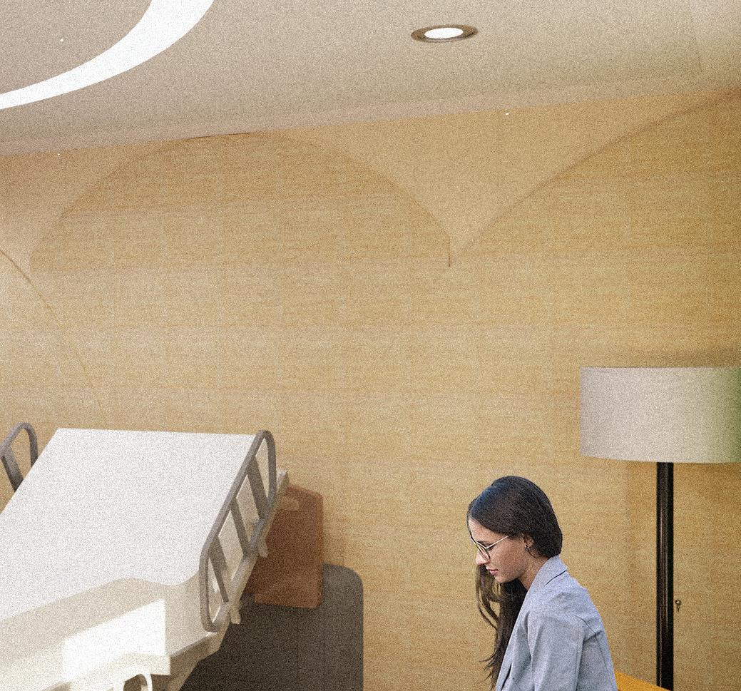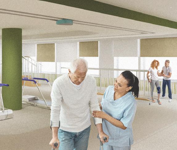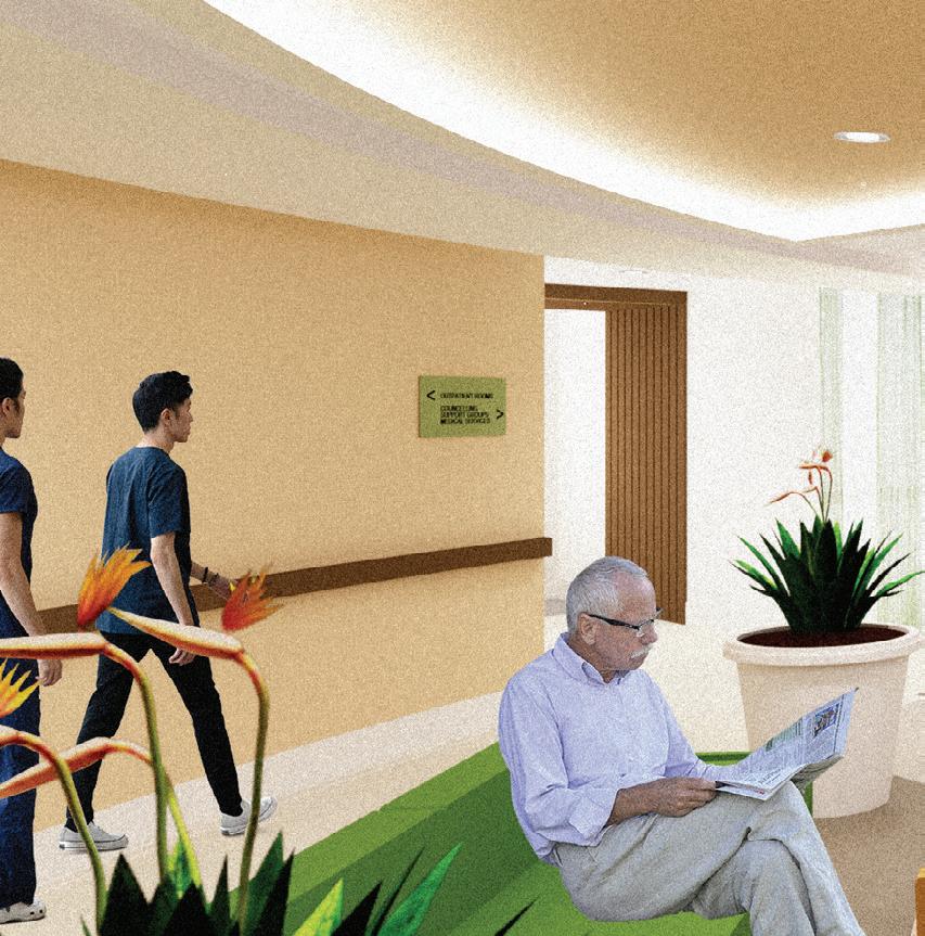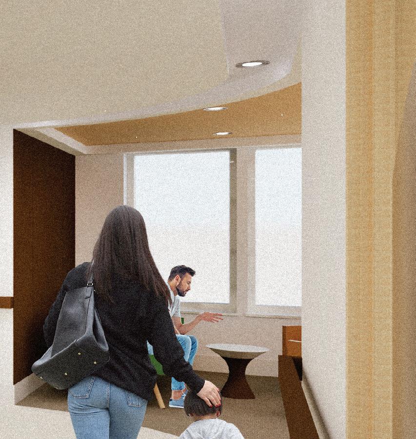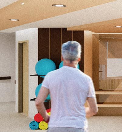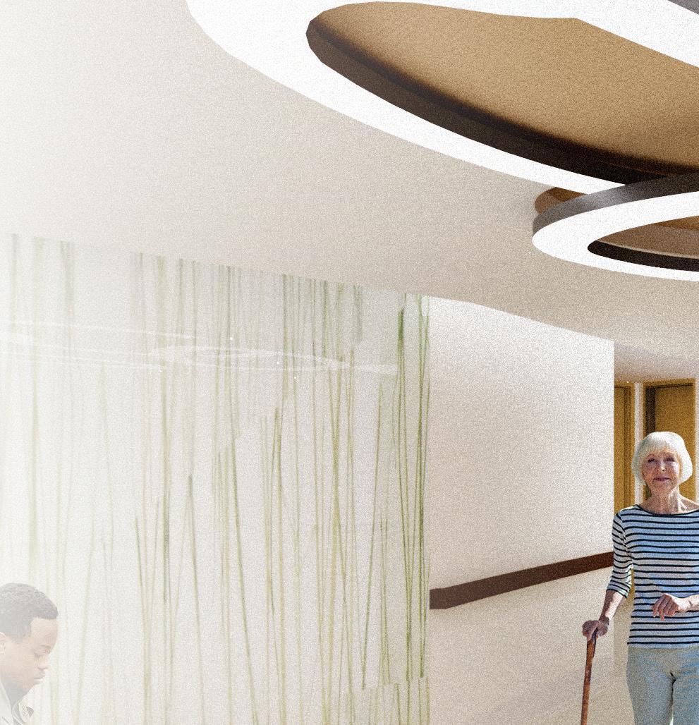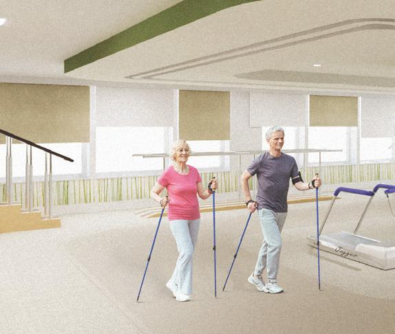 The sixth floor of the building is dedicated to the therapy unit for individuals with Parkinson’s, providing customized rehabilitation spaces based on their movement abilities. Activities are tailored to suit each individual’s needs, considering the diverse physical and cognitive traits associated with the condition. The design of this floor aligns with the medical unit, ensuring easy navigation and a cohesive aesthetic. Careful spatial planning ensures privacy in public areas and maximizes views of nature for therapeutic purposes.