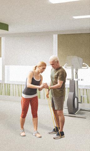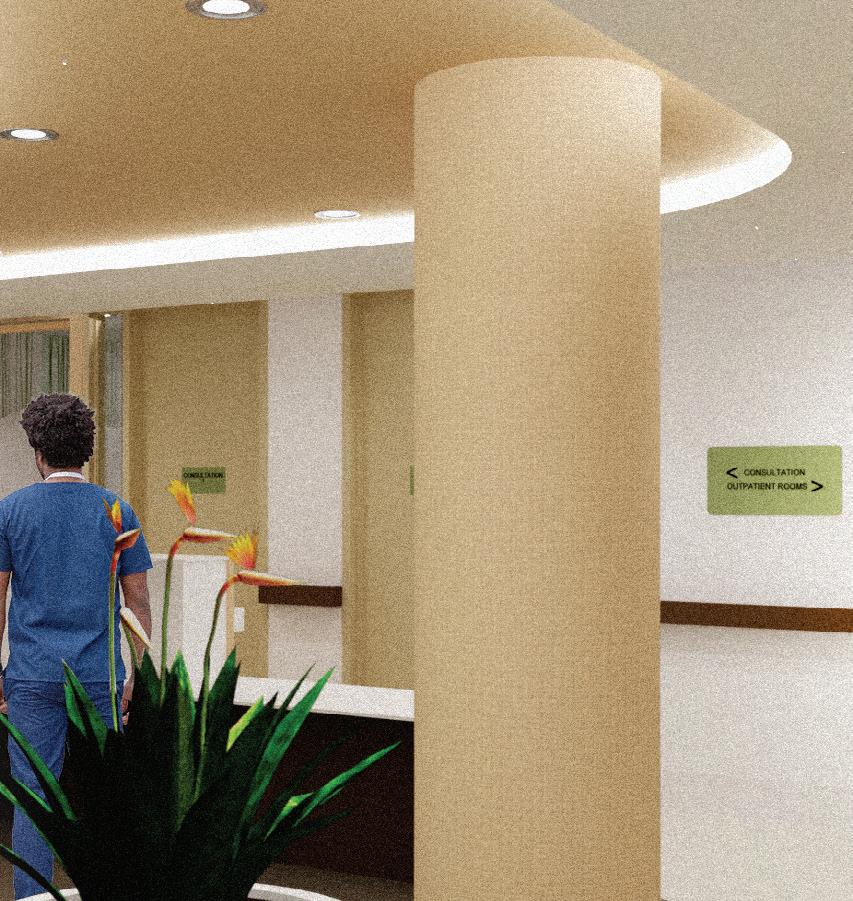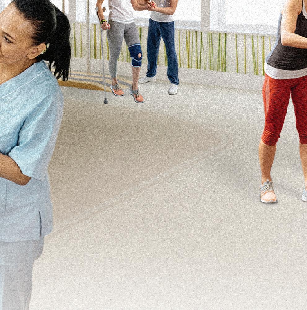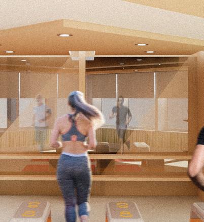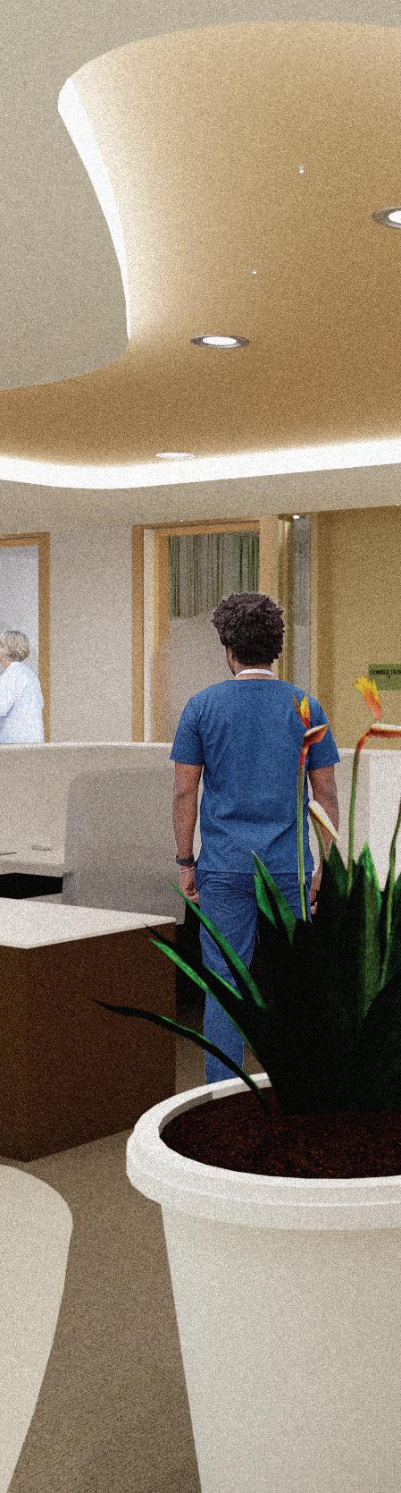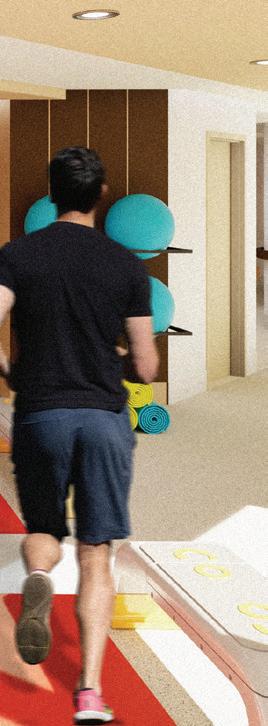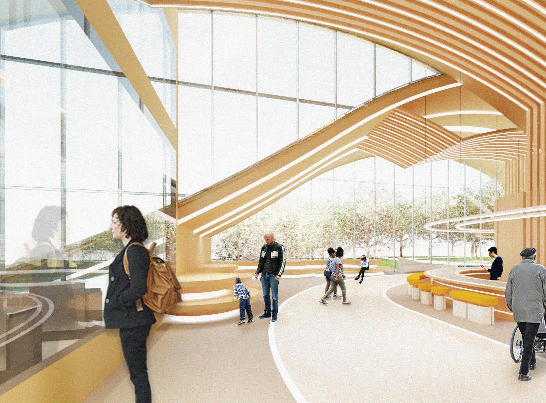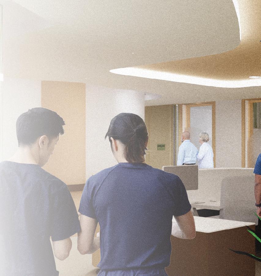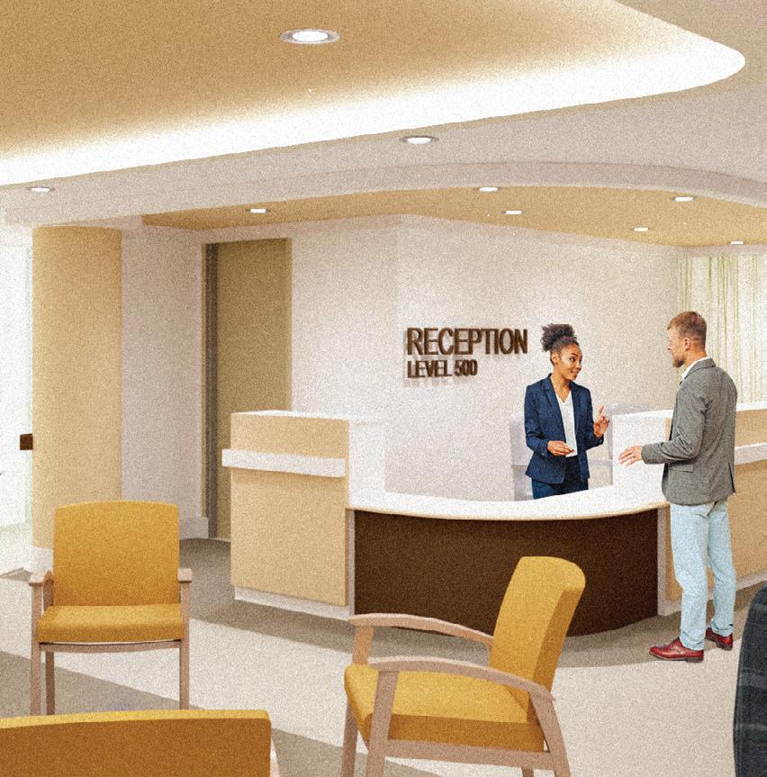 The fifth level of Five Donald is the clinical and examination floor of the rehabilitation clinic, providing healthcare support for non-physical symptoms of Parkinson’s. It offers speech and language pathology, nutrition counseling, and specialized counseling for patients, families, and caregivers. The floor includes an inhouse medical laboratory and a radiology department. The layout is designed for easy navigation for individuals with Parkinson’s, with curved pathways and private areas with city or river views.