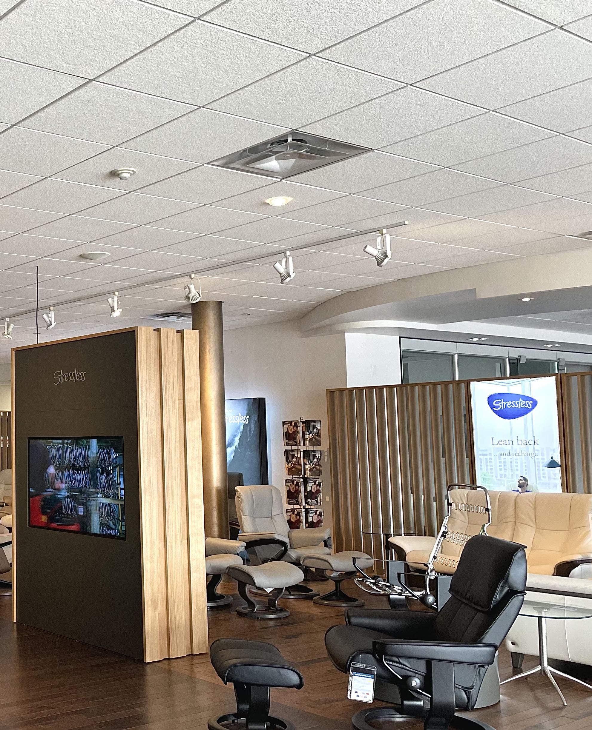 I was assigned to lead the redesign of the second showroom at Kesay Furniture store, featuring products from the Stressless brand. The redesign involved creating an aesthetically pleasing and functional showroom that effectively showcases the products while staying true to the brand’s identity. By organizing furniture into cohesive vignettes and using lighting to create focal points, the design aims to draw customers’ attention to key pieces. The objective was to integrate branded elements from Stressless to boost brand recognition and provide an immersive shopping experience. The ultimate goal is to inspire customers and establish a connection with the brand, helping them visualize the products in their own homes.