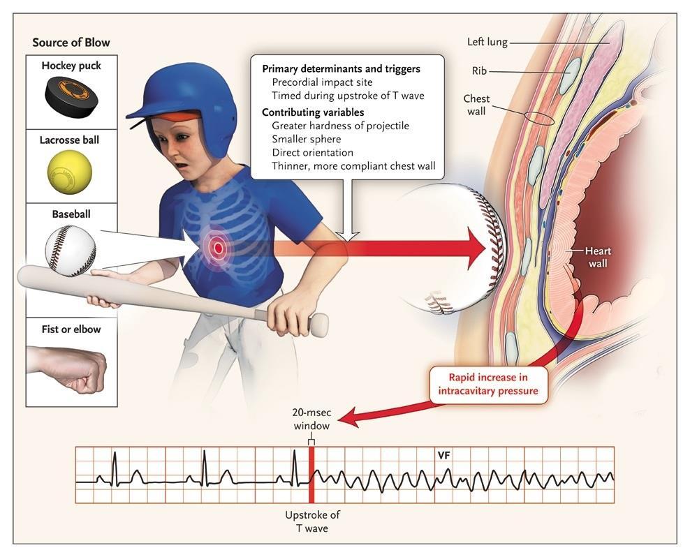 Commotio cordis conduce a una arritmia letal que resulta por traumatismo contundente y no penetrante sobre el precordio, o pared torácica anterior. Basado en modelos y datos animales. de los ECG iniciales registrados en el campo o en la emergencia departamento (DE), fibrilación ventricular (FV) y ventricular La taquicardia (TV) son las arritmias más comunes. Es de destacar que hay dos informes de casos de fibrilación auricular. Resultante de un traumatismo cerrado en la pared torácica en atletas; sin embargo, el ECG se obtuvo en el servicio de urgencias 25 minutos después de la colisión en un caso y en el campo en el segundo.