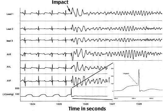 Los modelos experimentales en cerdos también sugieren que los proyectiles que viajan a velocidades moderadas tenían más probabilidades de inducir fibrilación ventricular, mientras que velocidades más altas podrían causar daño estructural y contusión cardíaca en lugar de arritmias.
