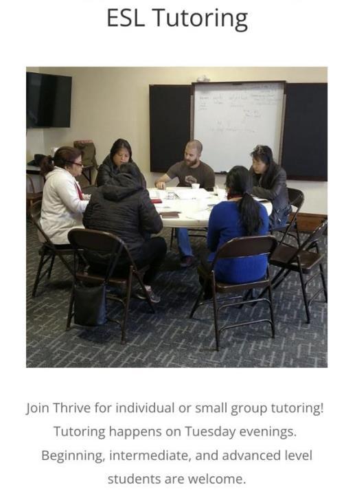 Nuestro grupo se centró en el impacto que tienen los servicios de Thrive Internationalen las diferentes culturas de Williamsport. Comenzamos yendo a Thrive para entrevistar a la subdirectora de Thrive, Jolene Harbach.Primero, le preguntamos ella, cómo ayuda Thrive a las personas internacionales a queviven en Williamsport? Ella contestada con“Nemos dos partes de Thrive. Hay un parte de lingüística que desde esta parte de la clase de inglés y ayudamos a la gente aprender inglés,” después, ella mencionó algunos de los usos prácticos de saber inglés en una ciudad que usa principalmente el inglés:“A veces ellos (Thrive estudiantes) quieren para estudiar porque ellos quieren ir a la universidad aquí o pasan sus exámenes para conseguir la ciudadanía estadounidense. Otros quieren estudiar inglés para sus trabajos o para conseguir un consiguetrabajo o a simplemente para vivir y comunicarse.” Los grupo también queria ver cómo se llevaban a cabo las clases de inglés. Nosotros vimos dos estudiantes estudiando palabras y frases para usar en un restaurante. Después de su clase, nosotros tuvimos la oportunidad de entrevistar a los estudiantes de inglés. Les preguntamos cómo Thrive les ha ayudado a hacer la transición dentro la vida en Williamsport. En foto “ Unirse para recibir tutoría individual o en grupos pequeños. La tutoría ocurre los jueves por la noche. Los estudiantes de nivel principiante, intermedio y avanzado son bienvenidos.”