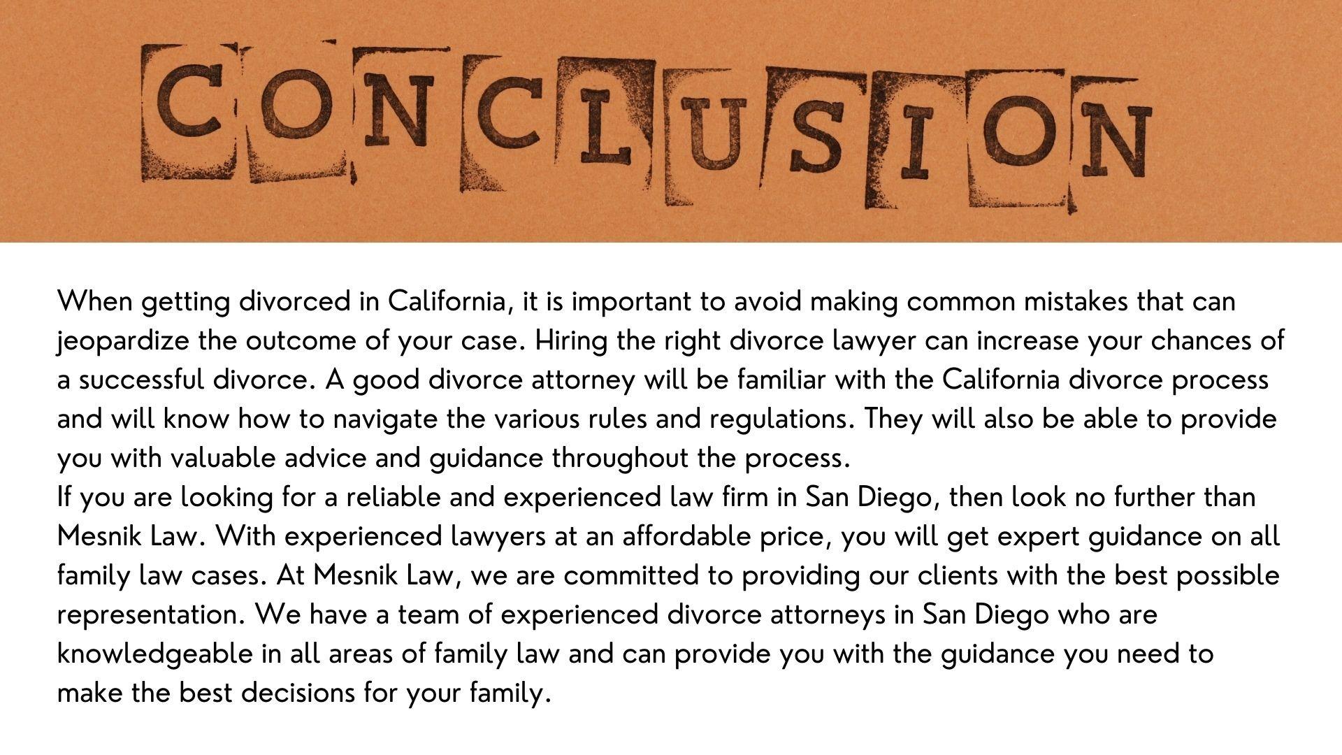 Divorce can be a difficult and emotionally draining experience, especially if you are living in San Diego, California. It is important to be aware of potential mistakes. The Experts of Mesnik Law shared information about mistakes made by divorcing couples in California and how to avoid them. We are one of the best divorce attorneys in San Diego. Visit our website for more details.