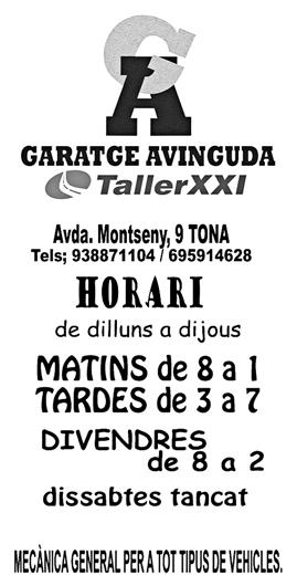 revistona no comparteix forçosament l’opinió expressada en els articles publicats. 1018 ESCAPE ROOM ENTRA AL TOP 100 MUNDIAL LA PISTA 2 DEL PAVELLÓ ESTRENA PARQUET 25 ANYS AL VOSTRE SERVEI C/ Barcelona 41. Tona Tel. 93 812 46 94 www.estilnou.com NOVES PROMOCIONS A ESTILNOU ÒPTICS MUNTURA + LENTS PROGRESSIVES 149 € LENTS DE CONTACTE 20% DESCOMPTE LÍQUIDS PER LENTS 50% DESCOMPTE MUNTURA + LENTS MONOFOCALS 59 € EL NADAL VA OMPLIR EL POBLE