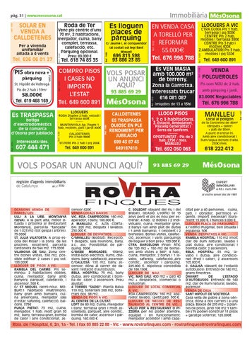 RODA Dúplex 2 hab, estudi i terrassa 400€ -----MUNTANYOLA Ap. Pagès 1 hab, mobles, pati i jardí 300€ -----CALLDETENES Pis 2 hab 380€ ----ST.PERE Pis 2 hab i pq 260€
