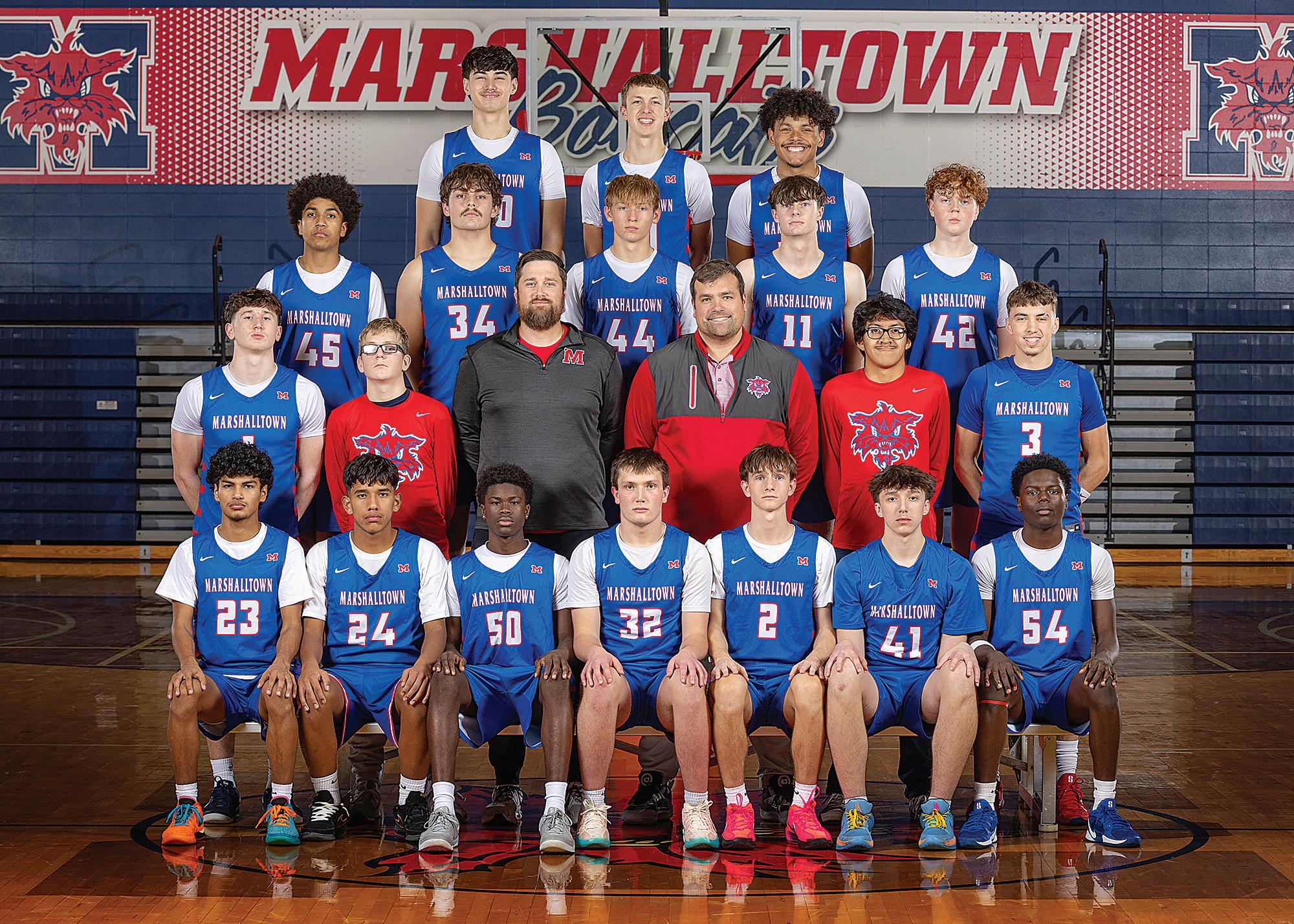 Marshalltown boys’ basketball team returns four starters from a year ago. Pictured are (from left) first row: Isacc Ceniceros, Damian Segovia, Faith Banissan, Larrs Schoenfelder, Gavin Misek, Tyler Dorothy and Camron Holmes; second row: Jamison Niehouse, manager Noah O’Clair, assistant coach Joe Stonner, head coach Michael Appel, manager Shoney Albert and Drake Gersema; third row: Ethan Matlock, Hunter Fors, Garrett Thede, Aiden Holmgren and Oliver Young; fourth row: Talon Halsted, Kyle Smith and Jacob Hayes.