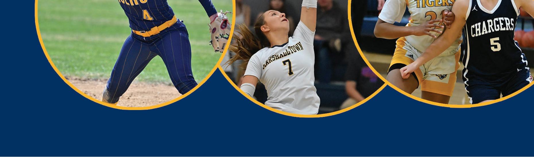 Marshalltown High School’s seven varsity sports are pictured from the 2024-25 season, featuring (clockwise from top left) girls bowler Aubrey Webber, boys basketball’s Jacob Hayes, girls basketball’s Kinsley Bowie, state-qualifying boys