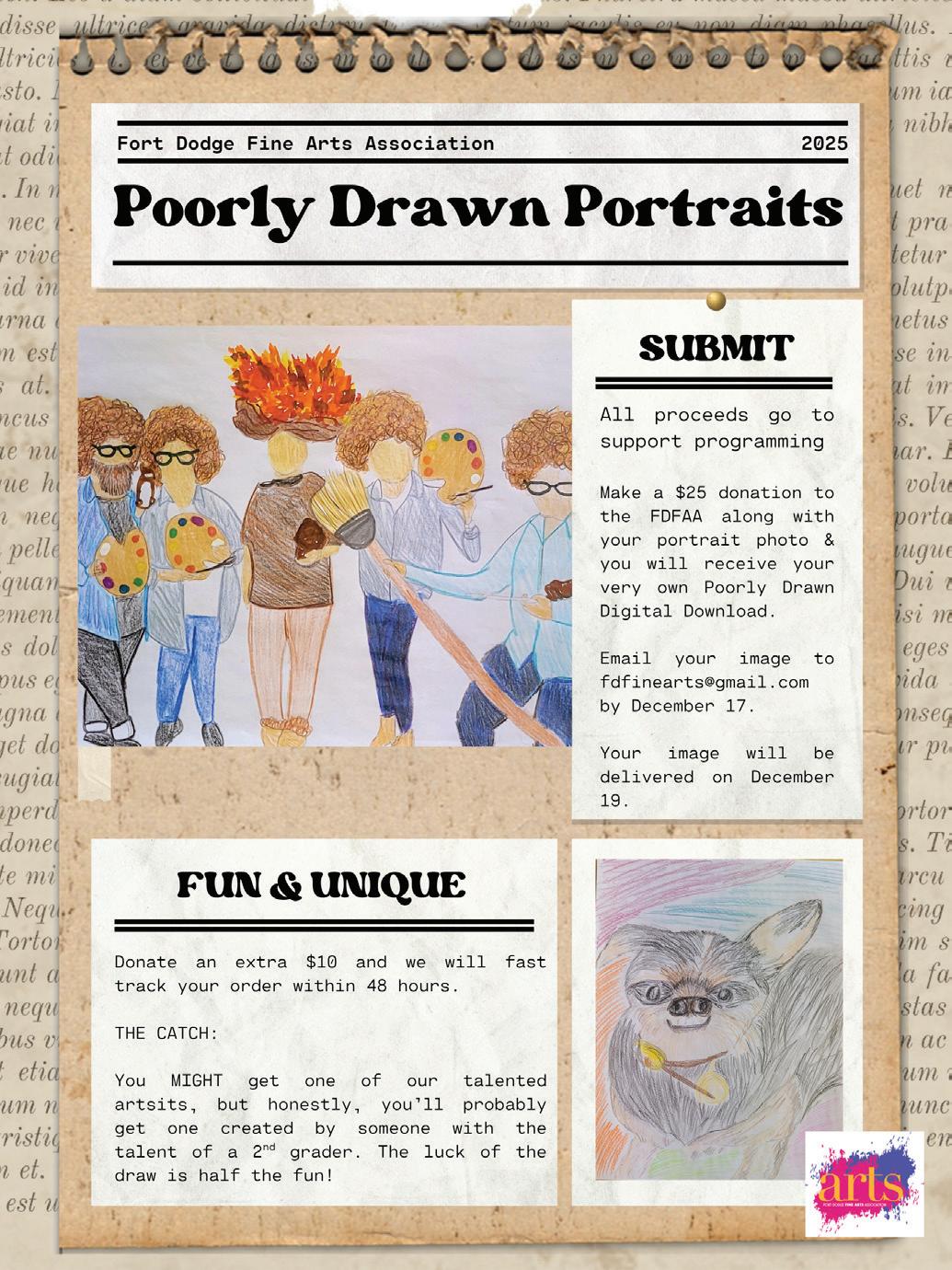 The Fort Dodge Fine Arts Association serves as a bridge between artists, audiences, and artsorganizations across our community. We help connect creative people and promote the incredible variety of music, theatre, visual arts, and cultural opportunities that exist right here in FortDodge. Through partnerships, event promotion, networking, and our membership program, we make it easier for people to discover and engage with the arts. We also provide opportunities for collaboration, professional development, and youth involvement—ensuring the arts continue to grow and thrive for generations to come.
