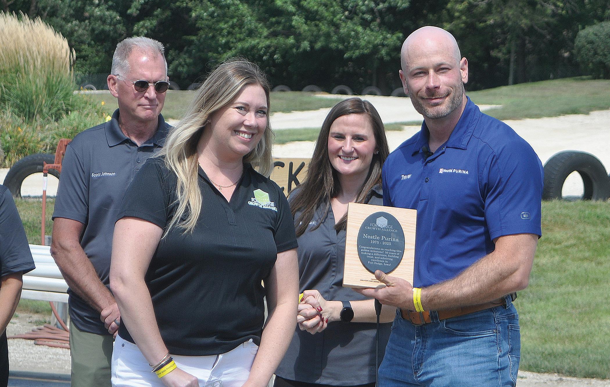 BOTTOM PHOTO: Trever Morgan, right, the factory manager for Nestle Purina PetCare in Fort Dodge, holds a plaque commemorating the 50th anniversary of the plant. The plaque was presented by Astra Ferris, left, the chief executive officer of the Greater Fort Dodge Growth Alliance. Two members of the Growth Alliance Ambassadors, Scott Johnson and Kate Stucky, stand behind them.