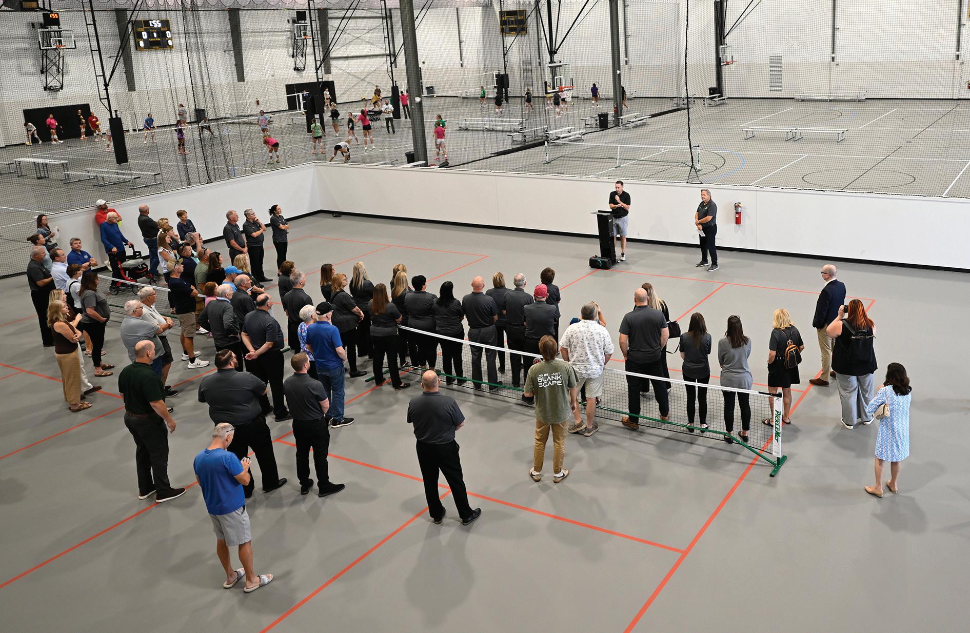 The Pavilion Sports Complex, located on the west side of the property that was once Crossroads Mall, includes space for basketball, volleyball, and pickleball. It also includes batting cages and a walking track. It opened in October.