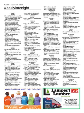 weeklylatenight SUNDAY’S MOVIES 12:00 a.m. (LIFE) (12:02) The Switch (2010) (PLEX) (12:10) The Next Karate Kid (1994) (TBS) The Forbidden Kingdom (2008) (MAX) (12:20) Cleanskin (2012) 12:30 a.m. 7 World Gone Wild (1988) (ENC) (12:45) Thunderball (1965) 1:00 a.m. (TCM) Blackmail (1929) (USA) Little Miss Sunshine (2006) (HBO) (1:15) American History X (1998) (SHOW) (1:20) Hard Rain (1998) (STARZ) (1:25) Sparkle (2012) 1:30 a.m. (DSN) Buffalo Dreams (2005) (TNT) Training Day (2001) 2:00 a.m. (PLEX) Racing With the Moon (1984) (TBS) The Time Machine (2002) 2:30 a.m. 7 X (1963) (TCM) Frenzy (1972) (MAX) (2:40) Fled (1996) 3:00 a.m. (WGN-A) Darkness (2002) (ENC) You Only Live Twice (1967) (HBO) (3:15) Courage Under Fire (1996) (STARZ) (3:25) Underworld: Awakening (2012) 3:30 a.m. (SHOW) Knuckleball! (2012) SUNDAY’S SPECIALS 12:00 a.m. (ANML) Mermaids: The New Evidence (COM) (12:11) Katt Williams: It’s Pimpin’ Pimpin’ 12:30 a.m. (CMT) Ron White’s Vegas Salute to the Troops 2013 1:00 a.m. (ANML) Alien Autopsy (TRAV) Mega RV Countdown 2:00 a.m. (COM) (2:02) Chris Rock: Kill the Messenger 3:30 a.m. (PLEX) (3:50) Conversations MONDAY’S MOVIES 12:30 a.m. (PLEX) Pharaoh’s Army (1995) (ENC) (12:50) Valley Girl (1983) (MAX) (12:50) Mulholland Falls (1996) 1:00 a.m. (LIFE) (1:02) Madea’s Family Reunion (2006) (TBS) Charlie’s Angels: Full Throttle (2003) (TCM) The Birth of a Nation (1915) (USA) (1:11) Pistol Whipped (2008) (HBO) (1:20) Pushing Tin (1999) (STARZ) (1:10) The Butterfly Effect (2004) 1:30 a.m. 7 Up in the Air (2009) (SHOW) (1:45) Scream 4 (2011) 2:00 a.m. (PLEX) (2:05) Godzilla vs. Space Godzilla (1994) 2:30 a.m. (ENC) Before Sunrise (1995) (MAX) (2:40) Elliot Loves (2012)