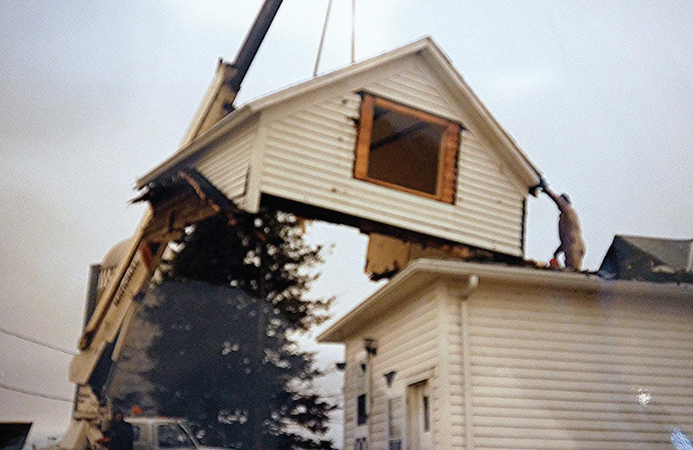 half-story part of the house. A crane was used to lift the half story off the house, setting it on the ground. Black plastic became the roof.