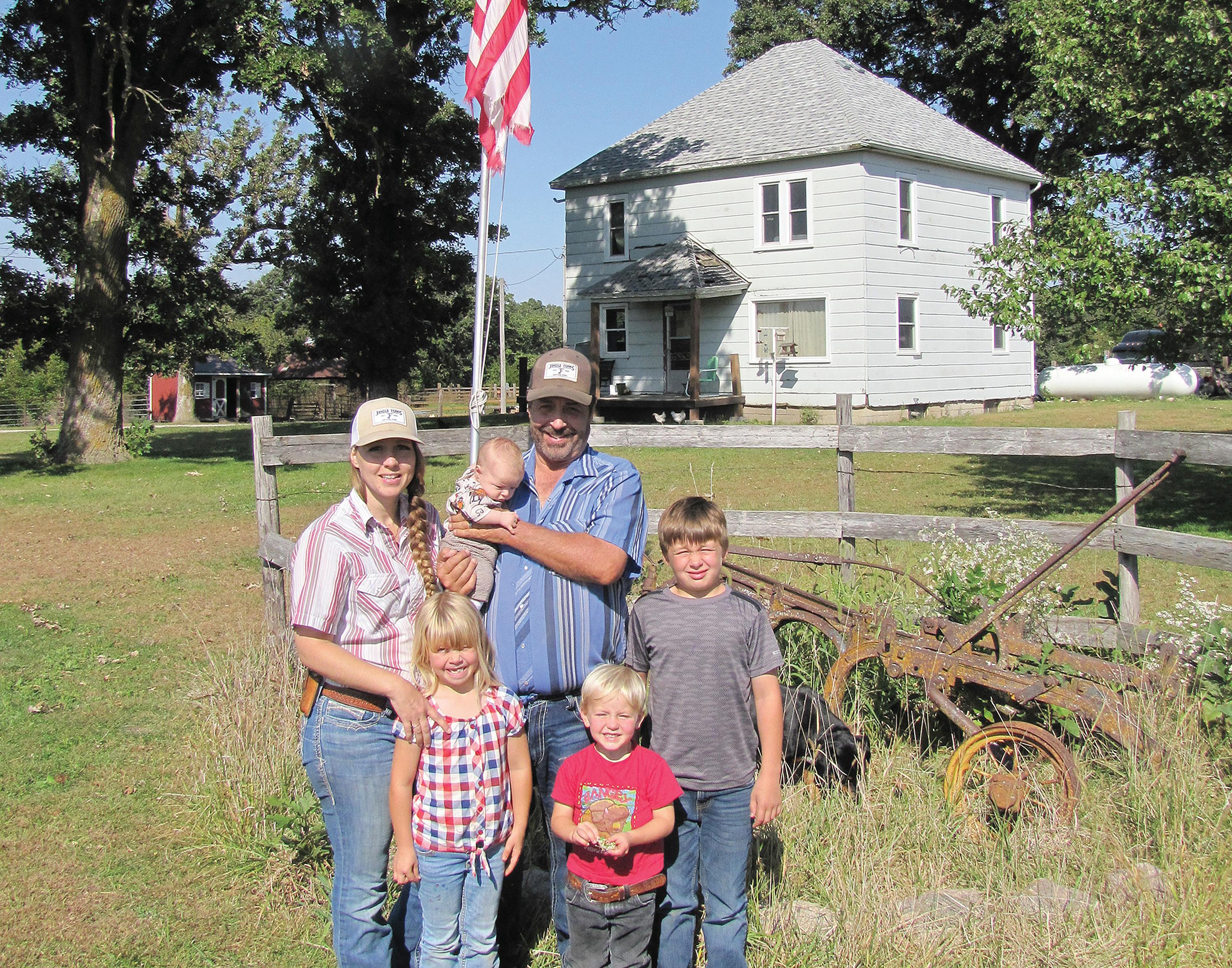 RON AND SHARON JONDLE stand outside their farm house, with baby Barrett, and children Anna, Reno, and Dylan.