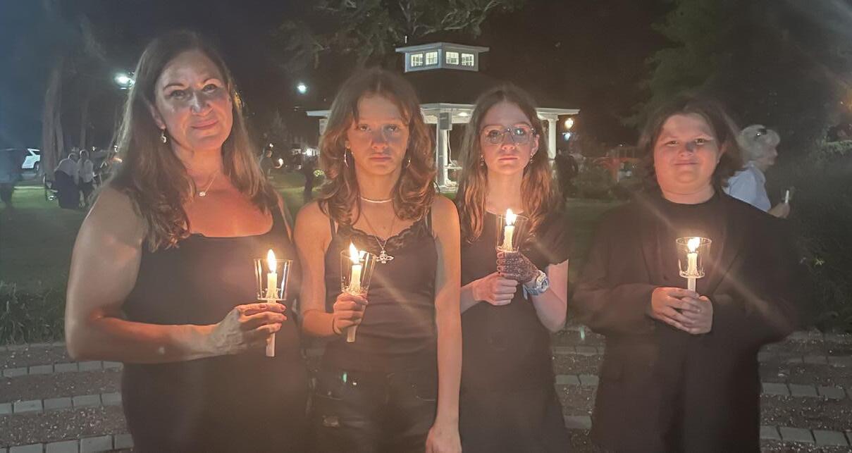 (From left) - Chorus teacher Rachel White and Oakdale-Bohemia Middle School students Ally Meloe, Lilly Ceramello, and Dylan Dowdell lit candles at the memorial.