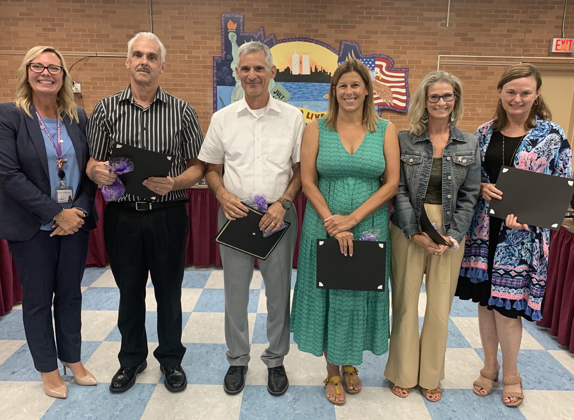 He congratulated elementary music teacher Mark Abbonizio, middle school special education teacher Monica Consalvo, maintenance mechanic Willians Corona, elementary teaching assistant Vicky Jobst and elementary teachers Rachel Erickson and Laura Kelly.