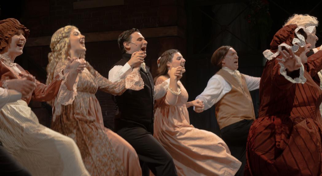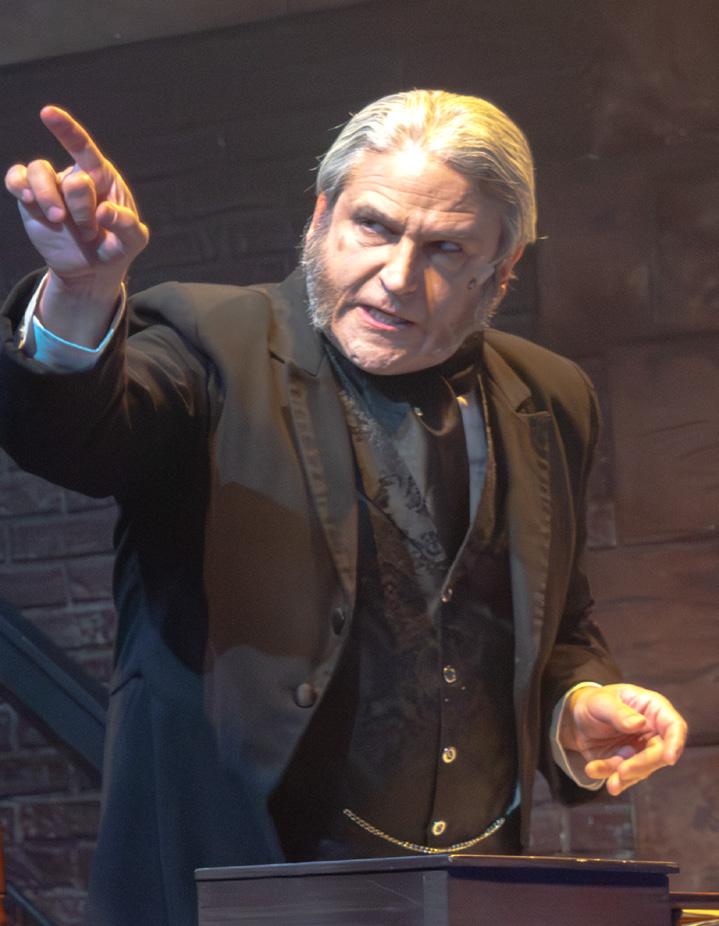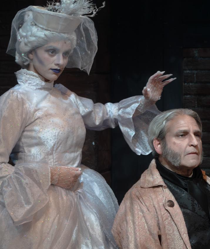 three more spirits. Julianna Rezza graced the stage with an angelic aura, playing The Ghost of Christmas Past. Radiant and glowing in a magnificent white, glittering gown, Rezza’s firm but gentle voice resonated throughout the theatre. Theatre Three veteran Scott Hofer is a natural-born comedian. His spot-on portrayal of The Ghost of Christmas Present offered some muchneeded comedic relief before the gigantic, ghastly, gruesome Ghost of Christmas Yet to Come prowls grimly across the stage, forewarning Scrooge of some future, possible, tragic events, including Tiny Tim’s death, if Scrooge does not change his greedy ways. A big round of applause goes out to Steven Uihlein for expertly manning this larger-than-life costume.