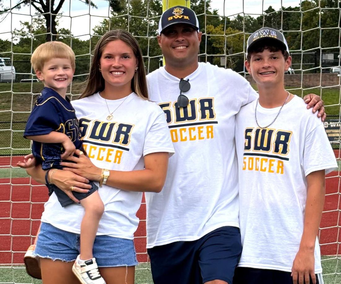 Prior to kickoff, Adrian Gillmore’s husband Tim and her daughter Kayla took center field to greet the crowd. Along with Shoreham-Wading River’s current girls’ varsity soccer coach, Lydia Kessel, who was coached by Gilmore and now has been tapped to fill her position.