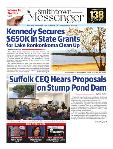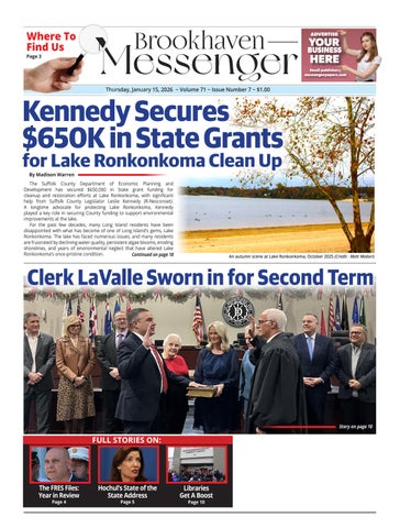 The Islip Messenger serves Ronkonkoma, Lake Ronkonkoma, Oakdale, Holtsville, West Sayville, Sayville, Holbrook, Patchogue, Bohemia, Islandia and Islip 69 Years of Service to Our Community USPS No. 470-440 Official Newspaper for County of Suffolk, Town of Brookhaven, Town of Islip, Inc Village of Lake Grove, Middle Country School, Centereach, Selden, Middle Island, Ronkonkoma Fire Dist, and Farmingville Fire Dist. Periodicals Postage Paid at Smithtown, NY and additional entries. Published every Thursday by: Messenger Papers, Inc. 558 Portion Road, Suite B Ronkonkoma, NY 11779 Email: editor@messengerpapers.com www.messengerpapers.com Entered as a second class matter at the Post Office of Smithtown, NY, under act of December 1, 1879. Periodicals postage paid out of Smithtown, NY. This newspaper will not be liable for errors appearing in any advertisement beyond the cost of the space occupied by the error. The opinions expressed in byline articles, letters and columns are those of the author and not necessarily those of Messenger Papers, Inc., its publishers or editors. Pictures submitted for publication remain property of the publisher. Postmaster: Send address changes to Messenger Papers Inc, P.O. Box 925, Smithtown, NY 11787 Thursday, March 14, 2024 3 News Published by Messenger Papers, Inc.