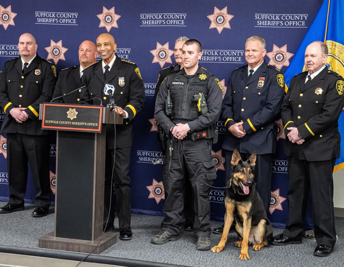 Suffolk County Sheriff Errol D. Toulon, Jr. (D) welcomed the Sheriff’s Office’s newest K9, Hondo, last week at a brief ceremony. Sheriff Toulon presented Hondo with his official shield, and Hondo showcased his skills including a drug search and an apprehension demonstration.