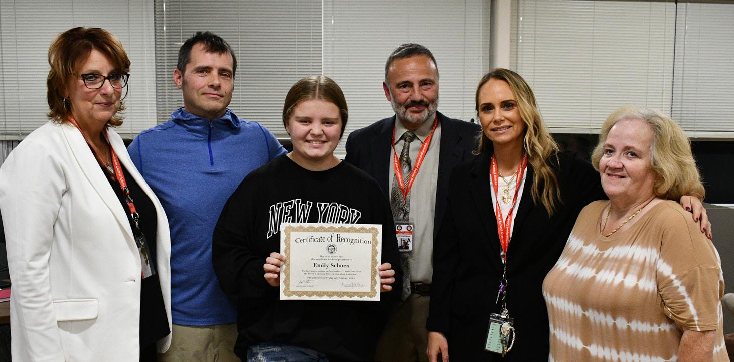 The Connetquot Central School District’s Board of Education recognized Connetquot High School student Emily Schoen during its October 7 meeting. She heroically performed the Heimlich maneuver on her driving education instructor, Diana Marino, when she noticed that she was in distress. The board and district thank and commend Emily for her brave actions and quick thinking.