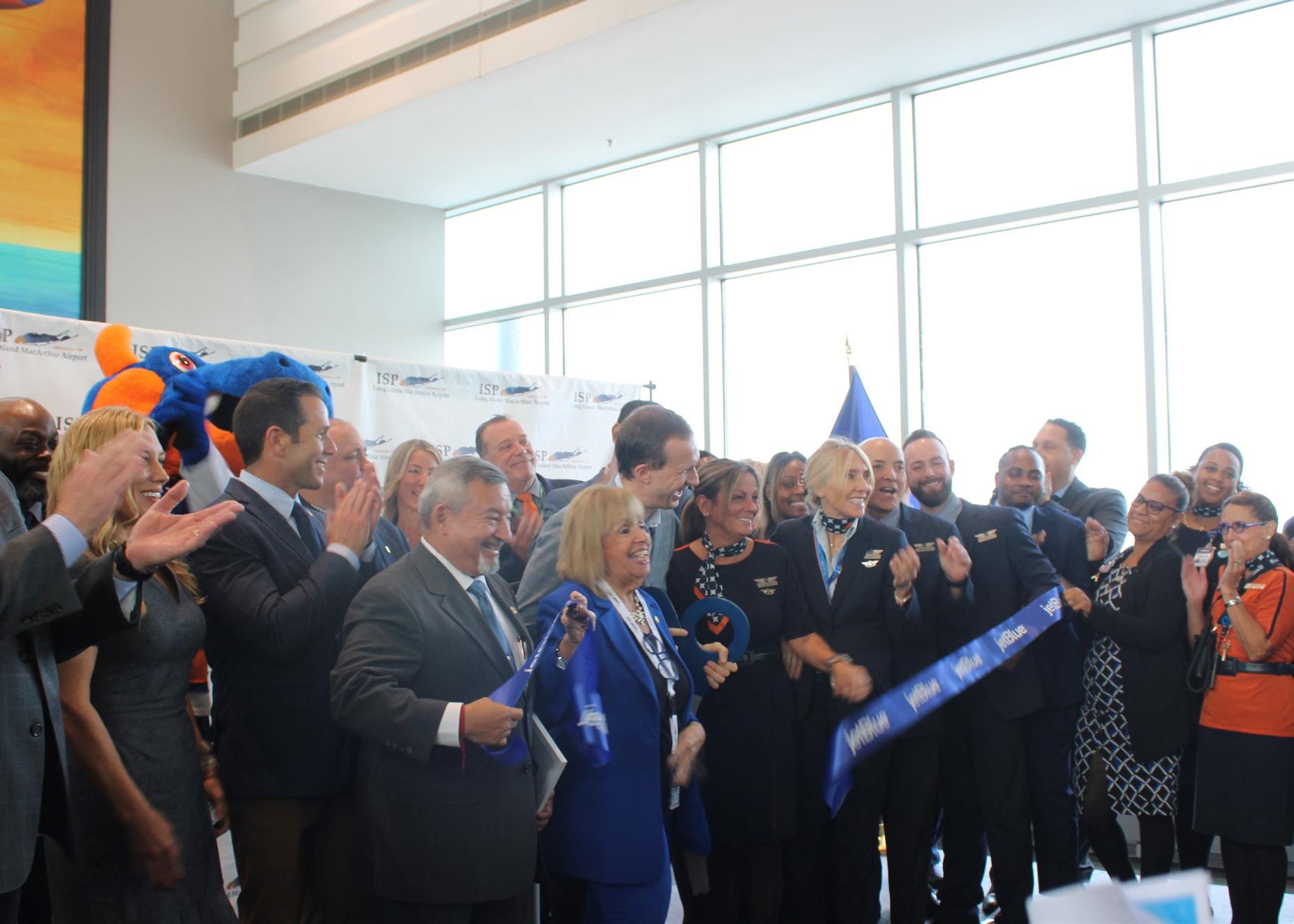 Officials gathered at Gate A1 inside the terminal to cut the ribbon on JetBlue’s inaugural flight from ISP, which was bound for Orlando, Florida.