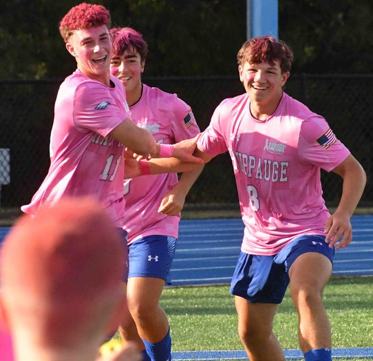boys’ and girls’ soccer teams took the field, sporting pink uniforms in honor of the cause. The boys team faced off against Eastport-South Manor Junior-Senior High School, earning a dominant 9-0 victory. The girls team competed against Comsewogue High School, playing a hard-fought game that ended in a narrow 0-1 loss. Between games, the energy remained high thanks to performances by the Hauppauge kickline, color guard and pep band.