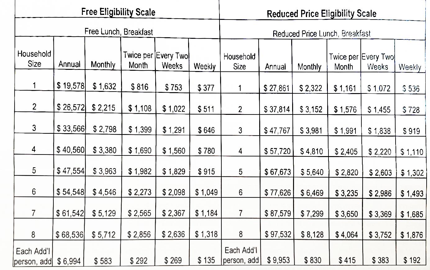 Other Households: Households with income the same or below the amounts listed above for family size may be eligible for and are urged to apply for free and/or reduced price meals. They may do so by completing the Application for Free and Reduced Price School Meals sent home with the letter to parents.