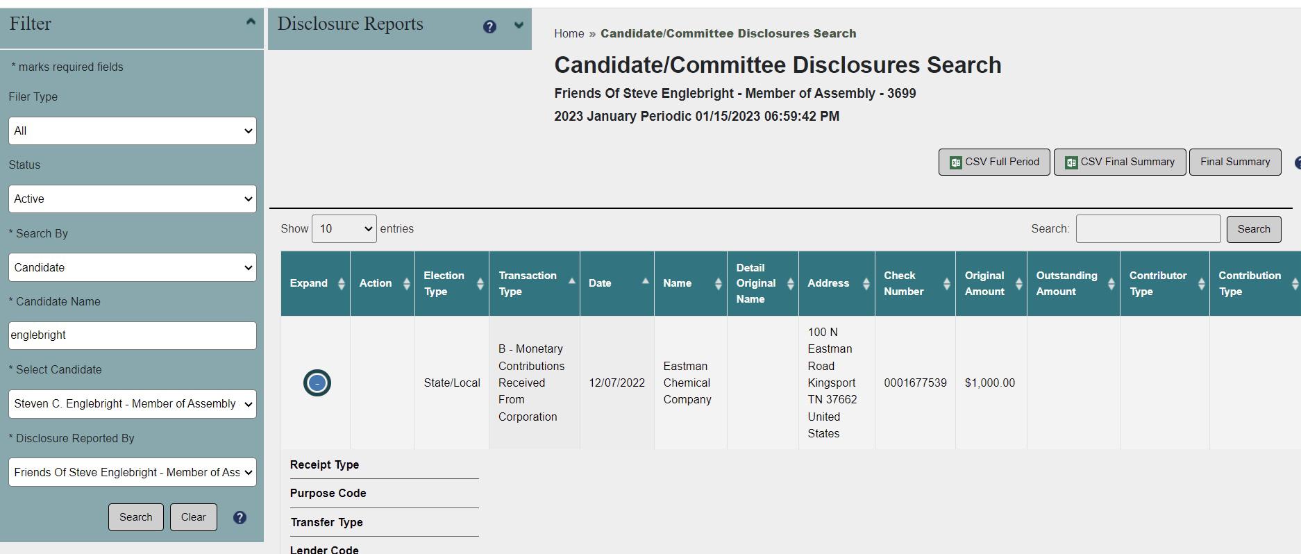 Campaign disclosure reports show a $1,000 donation from Eastman Chemical Company, with the address listed in Kingsport, Tennessee, to Friends of Steve Englebright on December 7, 2022. The money has been sent to Englebright’s campaign for this year’s Suffolk Legislature race.