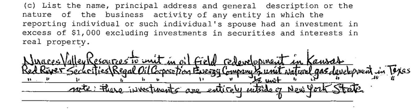 Englebright’s handwritten disclosure statements show that he invested at least $1,000 in Nueces Valley Resources. The written statement reads: